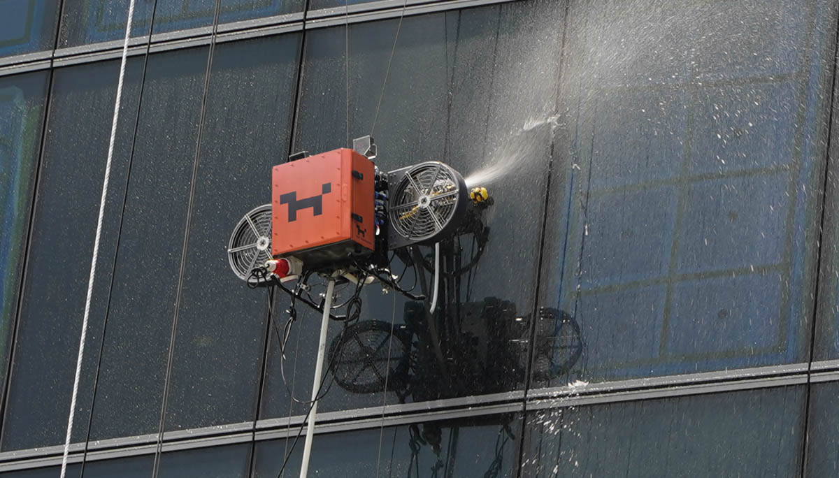 Skywash's water is filtered and contains only microparticles, which means no water stains are left on walls or glass. High-powered fans then dry the glass to achieve a perfect finish.